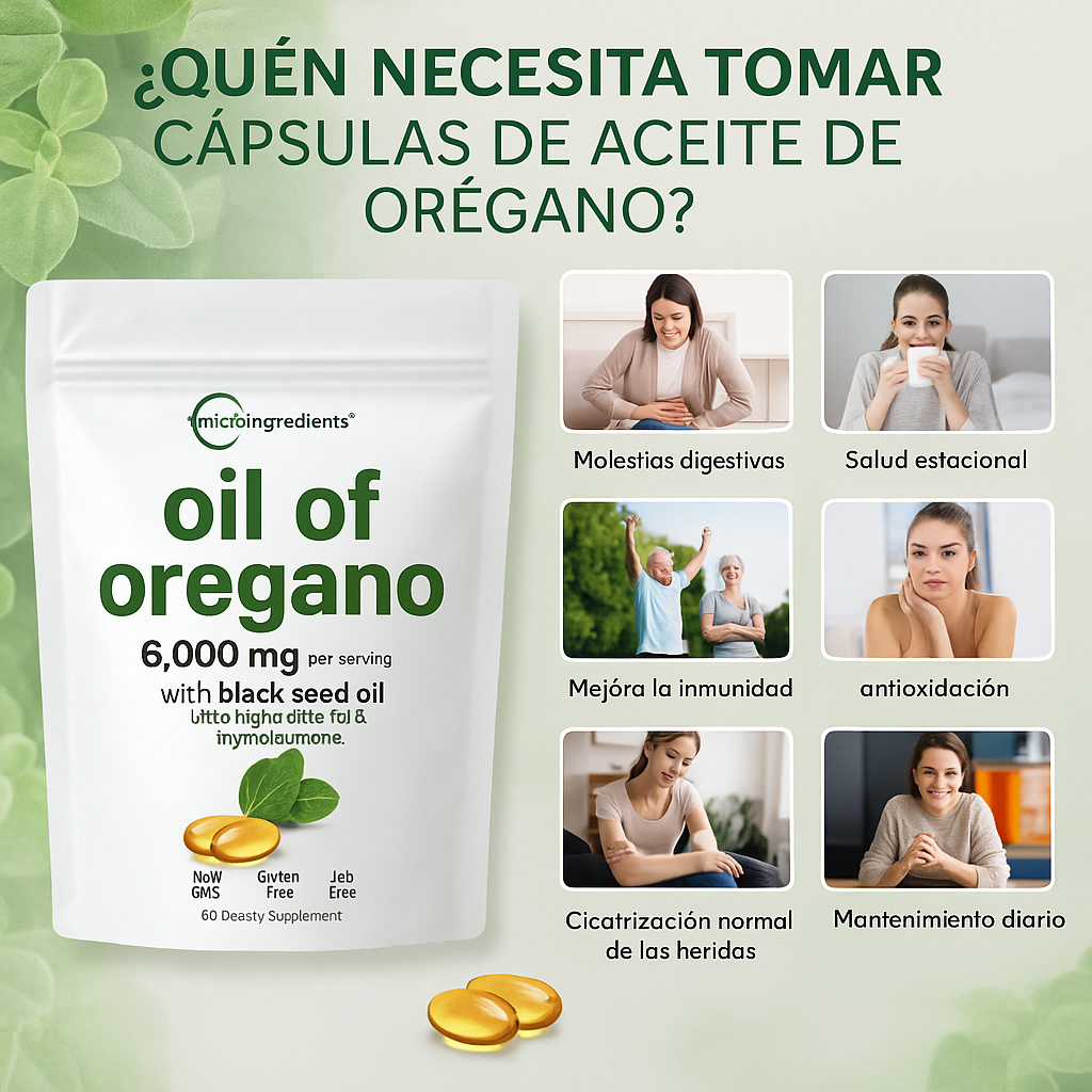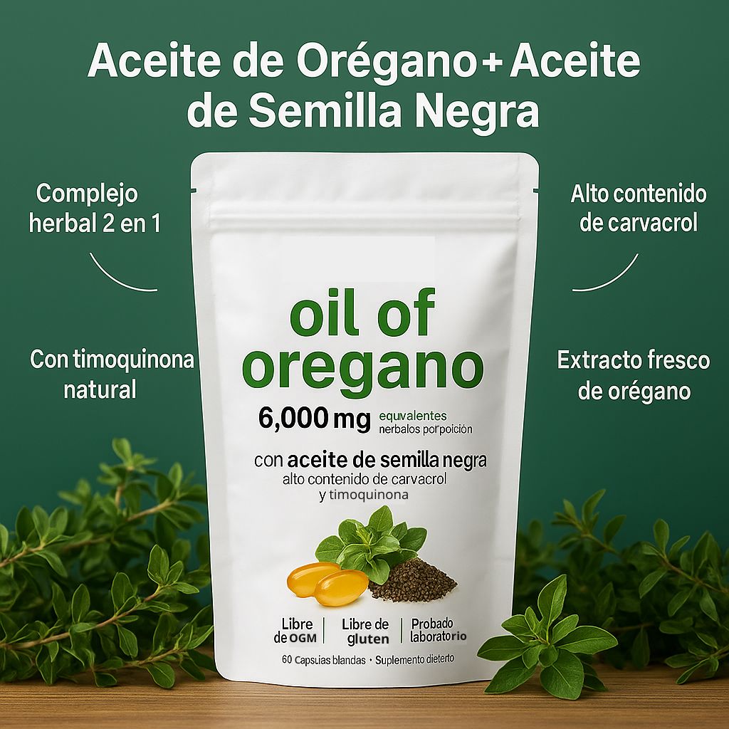Una poderosa fusión botánica que combina Aceite de Orégano y Semilla Negra, dos ingredientes milenarios conocidos por su apoyo digestivo, purificador e inmunológico 🛡️